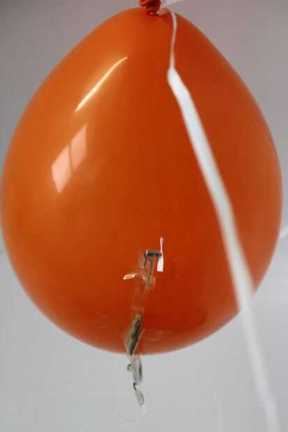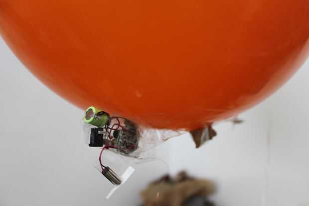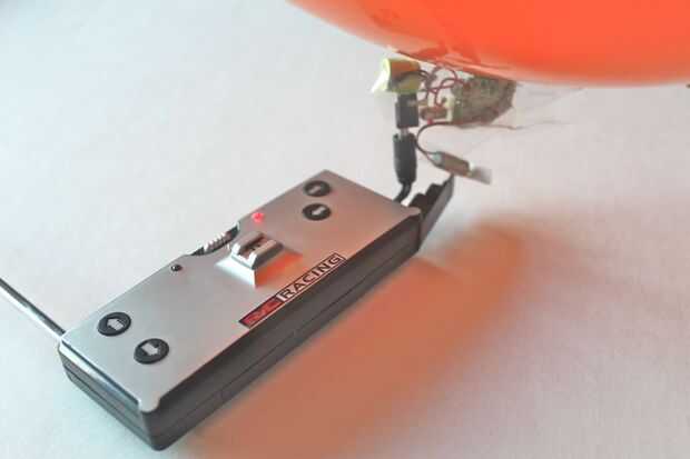 La placa de circuito y pincho del motor cola son pegadas al balón. Añadir arcilla de no endurecer un poco para recortar el peso del dirigible hasta apenas lento se hunde cuando no se aplica ninguna energía. Listo volar (puede que necesite recargar primero).