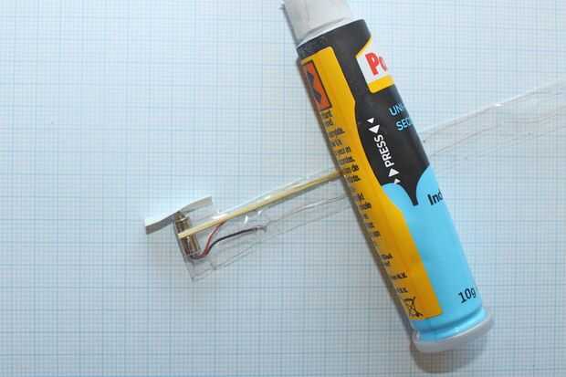 El motor de propulsión principal está grabado a la placa en un ángulo de aproximadamente 45°, asegurándose de que la hélice gira libremente. Realmente accidentalmente con cinta sobre el interruptor, pero todavía era capaz de manejarla.