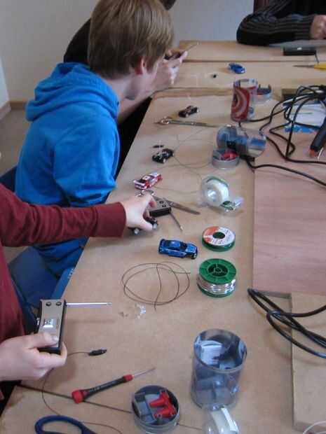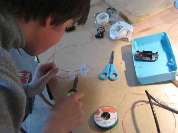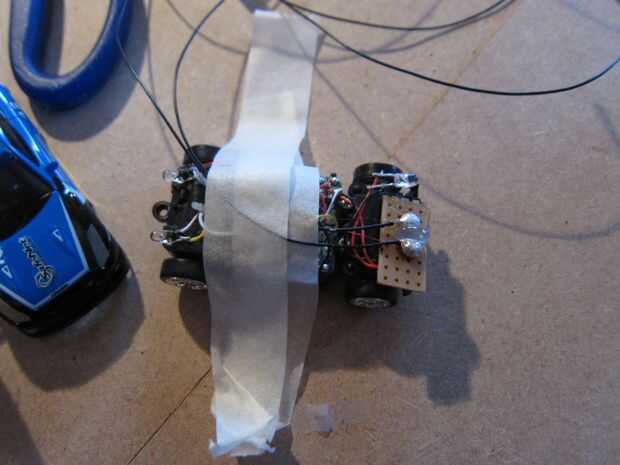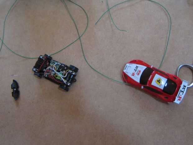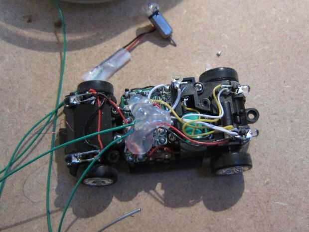 Después de abrir el coche Mini Racer y antes de desarmar nada, un pedazo de placa de circuito se inserta debajo de los alambres de cobre finos. Debe haber ninguna capa de cobre en la parte superior, nada debe soldarse a la pieza, sólo sirve para proteger el plástico debajo al soldar, mantener los cables bien aparte los cables largos son soldadas a cada alambre de cobre. Una buena gota de soldadura asegura el aislamiento de esmalte se quema y se hace buen contacto eléctrico. Después de que una pequeña gota de baja temperatura caliente derretimiento pegamento se agrega las puntas soldadas de no tocar uno al otro. No debe pegar al pedazo de placa de circuito. Después de cortar los cables de cobre finos al mecanismo de dirección, las conexiones soldadas se pegan encima de la placa de circuito (asegurándose de que no toque ninguna parte metálica directamente).