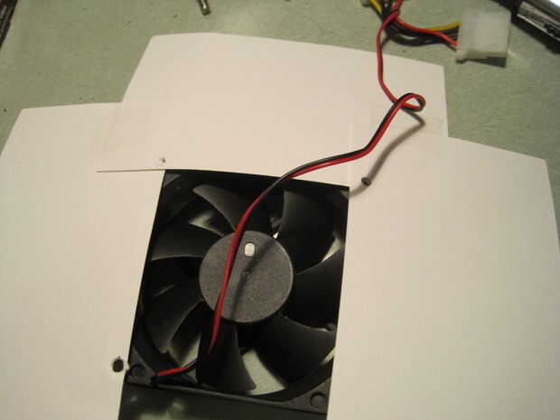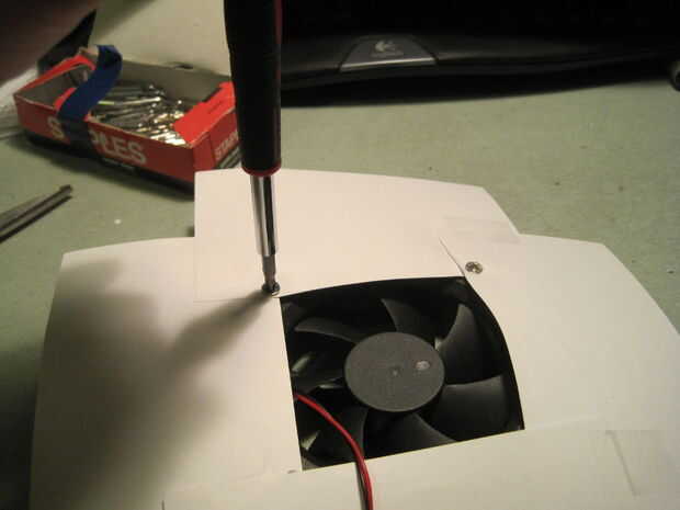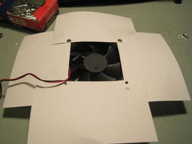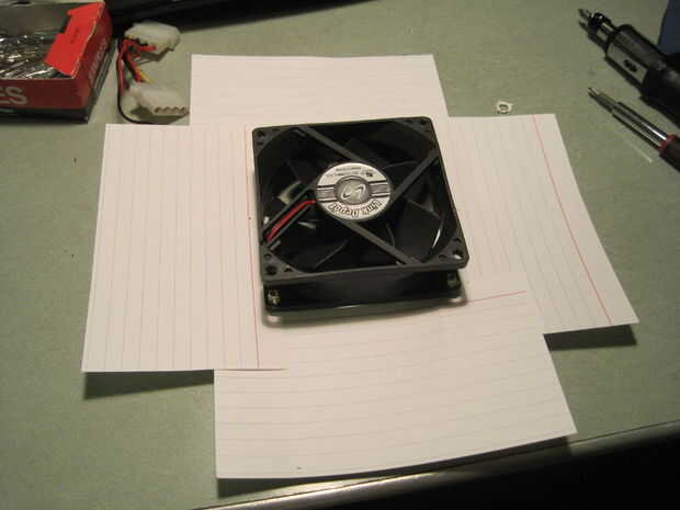 Colocar 4 hojas de índice tarjetas de longitud sabia a lo largo del borde de la parte superior del ventilador. No bloquee el flujo de aire del ventilador. Las tarjetas superponen. Mira las fotos de referencia. Las fichas de la cinta juntos. Empujar los agujeros en las tarjetas de índice donde se encuentran los orificios del ventilador. Inserte y apriete los tornillos. Los tornillos deben tener las fichas en su lugar ahora.
