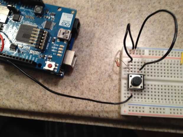 Con el uso de una resistencia de 2,2 K ohmios y un simple botón, vamos a añadir la capacidad de la señal para el dispositivo que estamos listos para descargar datos. El botón sí mismo tiene 4 cables. Primero dejamos que el cableado de esta conexión en un protoboard para validar el esquema de cableado. Esto nos permite el botón de prueba y asegurarse de que conseguirá una buena señal. También hacemos esto para que uno puede ver claramente cómo funcionará el cableado. El caliente y tierra están en la parte superior de este botón. La tierra también tiene una resistencia de Ohm de 2,2 K saliendo de él. La línea de señal se une al plomo enfrente del suelo y corre a 6 digital en el Arduino WiFi Shield. El suelo funciona a common ground. En un esfuerzo por reducir el número de hilos necesitamos soldar nos pondrá el botón al Digital 3. Así en esta foto caliente está siendo alimentada por digital 3.