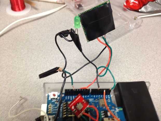 Ahora conectar el LED. Nos suelde el LED a tierra de cableado en el último paso, así como a un alambre que conduce a digital 5. Cuando se pulsa el botón de la concha, este LED proporcionará retroalimentación al usuario que los datos se descarga desde el dispositivo. El LED permanece encendido durante todo el proceso de carga y luego se apague. A través de una serie de escrituras digitales activar y desactivar el LED.
