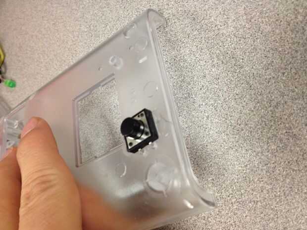 Sosteniendo el botón en la caja frontal, marqué 4 puntos en la parte posterior de la concha donde necesitaba un agujero para el botón para sentarse en y pasar los cables a través. Usando un taladro y broca 1/16", perforé cuatro orificios a través de esos puntos. Después cayó el botón en su sitio colocando los cables en los agujeros y, con una pistola de pegamento caliente, pegar el botón al caso.