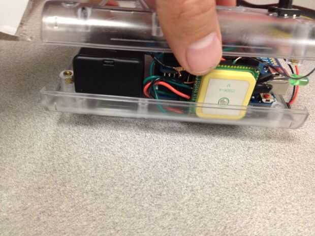 Ahora cerramos el caso. Esto es probablemente la parte más difícil de este proceso ya que tenemos que poner la unidad GPS a lo largo del lado del dispositivo, cuidado de no pellizcar algún alambre o dejando los cables debajo de la unidad GPS. Hacerlo hará que cierre el caso duro como la unidad GPS es tan amplia como el caso sí mismo; y un cable debajo de la unidad espesa las necesidades del proyecto. Nos con cuidado, coloque la luz