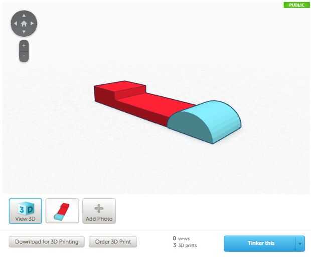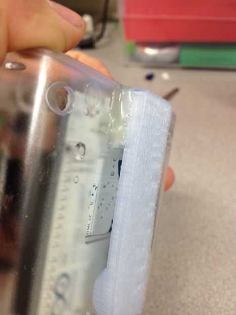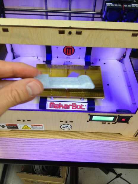 Imprimir un clip que nos podemos pegar a la caja para permitir que la unidad de clip fácilmente en la cinta. Utilizando TinkerCad elaboramos un clip. Entonces utilizamos ReplicatorG para crear un archivo .s3g que fácilmente podemos cargar en una tarjeta SD, coloque una impresora 3D MakerBot e imprimir el clip. Después de la impresión será pegar el clip en la parte posterior de la caja usando una pistola de pegamento caliente.
