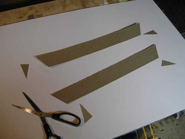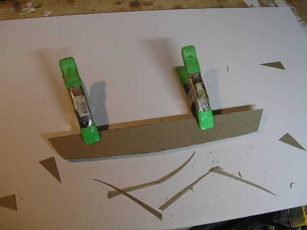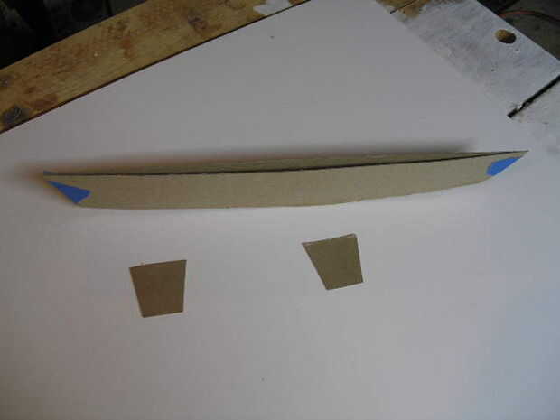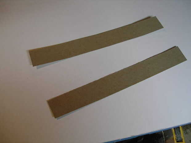 Paso 1 (Foto 1), maqueta de una pulgada a la maqueta de pie de la obra muerta (2 x 16 pulgadas) de cartón, papel o madera de fino modelado.