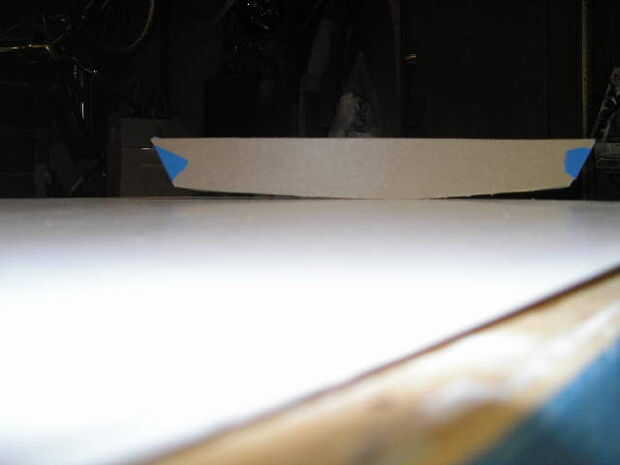 Quería unas 4 pulgadas de eje de balancín porque parecía buena. Eje de balancín más = más carga con capacidad (más volumen de flotabilidad), más fácil giro y velocidad más lenta (en algunos casos); menos rocker significa menos carga llevar, mejor seguimiento, volviendo más difícil, más velocidad potencial (en algunos casos). Pero la curva del eje de balancín es más compleja de lo que estoy haciendo parecer aquí. Utilicé un listón pequeño para dibujar la curva y (¡ obviamente!) un completo tamaño de las hojas de tamaño completas.