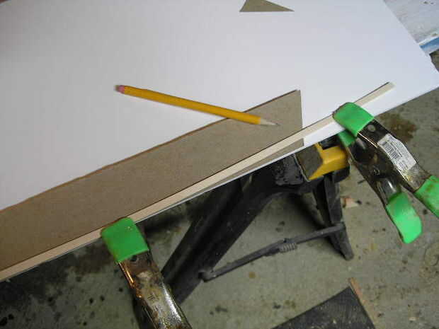 (b) corte separador palos (fácil) o mamparos (más difícil) para diseño en el perfil del casco. Cuña y colóquelos alrededor de la viga máxima (en tanto superior e inferior del barco) y la curva del perfil. Planifiqué un casco sharpie trapezoidal y había utilizado palos.