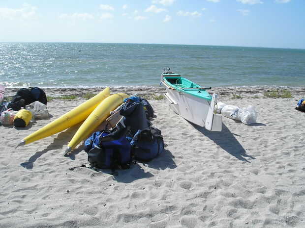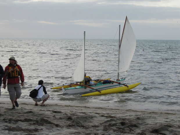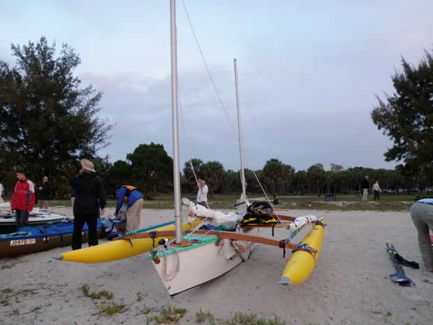 Utilicé cintas de trinquete para conect las amas inflables para el akas (comprado de NRS). El resultado fue un fino trimarán casi "instantáneo" (por el costo de las amas, que no son baratos), un barco muy ligero, que me llevó a través de un océano muy áspero. El truco con la configuración de las relaciones de una canoa doble deja las amas apenas toque el agua en reposo en la carga de la vela. Al dormir fondeados (que lo hice una noche) la amas no golpear mucho el agua y le molestan. Vela, el viento será el talón el barco encima, presionar una ama y la ama barlovento, de elevación y se reducirá su superficie mojada y que la ama levantada no coger las crestas de la onda y spray te. Prueba y ajuste en aguas tranquilas como un lago! Llevar llena botellas de agua para simular la carga de vestimenta típica.