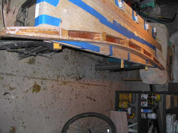 Construí akas de viga de caja curvada para obtener las dos amas que apenas toque la superficie del agua con mi equipo de expedición y el peso a bordo. El rayo total del barco era 10 pies (razas de Everglades desafío requiere vigas estrechas para llegar a través del puente "filtros" aunque el viejo filtro en Gasparilla es pasado, y el nuevo puente es más ancho). Estas son hechas con piezas sólidas de madera superiores e inferiores, y laterales de madera contrachapada, con bloques espaciadores de madera macizos para consolidar, con de epoxy pegamento. Libro de Gary Dierking, "Cómo para construir una canoa canoa," dice lo que usted necesita saber. Son ligeros y fuertes. Usé de abeto douglas lengüeta y surco techo tablones (con las lengüetas y ranuras cortar y cepillada verdadera), que se pueden comprar claro y seco de madera casi todas las tiendas. Nota: Abeto seco puede partir fácilmente, pues elegir a través de las piezas antes de su compra e inspeccionar muy de cerca. (Foto de los akas antes pieza final pegados por se muestra a continuación).