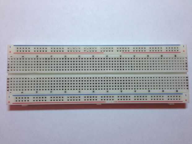 Un protoboard es una herramienta para establecer circuitos para las pruebas. Breadboards tienen muchos pequeños agujeros dispuestos en una cuadrícula de 0,1". Los orificios de las dos filas y filas de la parte inferior dos se ligan horizontalmente a través como se muestra entre líneas rojas y azules en el diagrama. Los otros orificios están conectados verticalmente. Cada columna de cinco agujeros está conectado con ningún vínculo a través del centro.