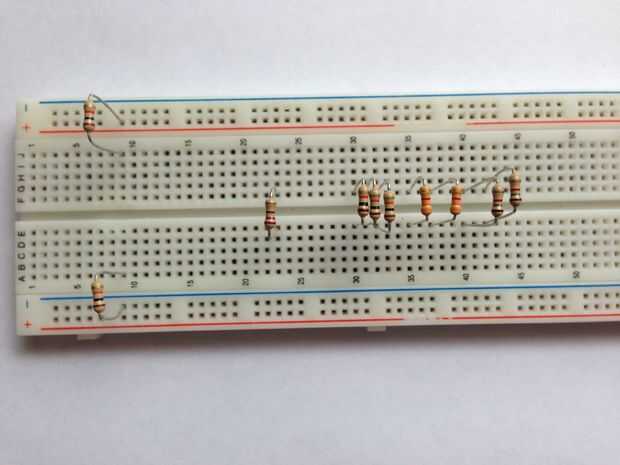 Encontrar la resistencia adecuada y poner los cables en los agujeros de la protoboard.