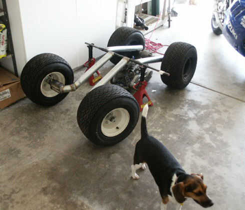 He hecho varios dibujos y no podía esperar a salir de mi cabeza y empezar a soldar! He tenido la idea de una suspensión independiente donde todos basculantes del pivote de un pin de centro común y los choques son en línea y attched a un perno superior paralelo. Me useda varilla de acero sólido como el pasador y la tubería correspondiente soldada con autógena a la oscilación de los brazos y les afilado con piedra para un buen ajuste. Voy a hacer lo mismo para los montajes de choque. Aquí ' s el comienzo de todo. Los 4 brazos con el perno inferior, frontal de dirección nudillos y 4 llantas de carro de golf con los ejes de rodamiento. Hice los brazos fuera del conducto eléctrico de 3". La charnela de dirección son simplemente 3/8" espesor planchas de acero con arandelas, tornillos y cojinetes para un muñón adecuado. Tuve que soldar una manga incrustada en los cubos posteriores a realizar un ajuste correcto en el eje 3/4" eje enchavetado.