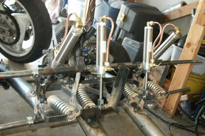 Aquí está una foto de los cilindros neumáticos sondeado para una aplicación de choque hidráulico (otra de mis ideas de cabello brained). Hay una línea de 10-gire la válvula para poder ajustar la velocidad de rebote. También, los muelles y soldadura son temporales (de ACE) hasta que la adecuada pedí vienen. Estos choques funcionaron bastante rematadamente bien. Puedo cerrar las válvulas y colocar en el carro sin se mover o puedo abrirlos y empuje la suspensión al suelo con facilidad. Este diseño tiene 18 pulgadas de viaje!