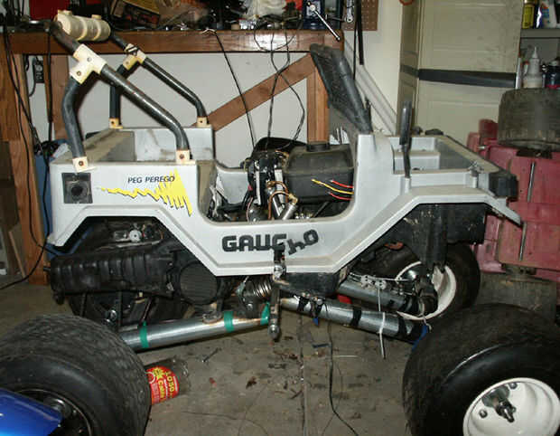 ¿Ves ahora los resortes adecuados bajo? Diseño y mecanizado guías de resorte y topes de aluminio específicamente para este proyecto. Niño fueron un dolor de instalar! Observe también el silenciador bajo el pozo de rueda trasera y el tanque de gasolina debajo del tablero. También puede ver los servos en el lado del conductor brazo del oscilación. Había juntado 2 servos de avión de escala super alto esfuerzo de torsión 1/4 juntos. No parecen tener mucho poder y el sistema pull-pull del cable parece que tienen demasiado juego por lo que sólo tendremos que ver cómo todo trabajo hacia fuera. Este motor es arranque eléctrico! ¡Sí bebé! Usé dos baterías de 6 voltios, así que puedo dividir mi RC controla al lado de una y usarlos dos en serie para comenzar y obtener cargados por el motor. Oh, sí, el motor es refrigerado por un aire 50cc dos tiempos con y transmisión variable automática de la correa de un ciclomotor honda. Sólo ocurrió que han reconstruido hace aproximadamente un año y tenía puesta alrededor. También se puede ver el cuerno del servo (pequeño blanco redondo) justo por encima del silenciador. Ha montado el motor y controla el acelerador y freno.