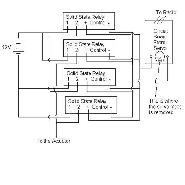 Me han preguntado para planes en mi dirección "servo". Por donde empiezo. En primer lugar mi carro es de 12V pero las cosas de la radio son 6V me paralled dos baterías de 6V por lo que podría ser utilizados para arrancar el motor y cobran demasiado por él. Entonces sólo tiró de una batería para alimentar el receptor y servos. Con eso, dijo. El dirver de relé de estado sólido que hice para el actuador es controlado por 6VDC pulsada del tablero servo pero interruptores 12V fuente de energía al actuador. Se debe utilizar de estado sólido tipo relés y no la bobina debido a los pulsos rápidos. Además, debe utilizar 4 del. Dos para la izquierda (+ y -) y dos para la derecha (+ y -). Todos los relés de hacen es tomar lo que la Junta servo envía al motor servo y controla los relés con esa señal para dar una señal similar solo 12V y alto amperaje.