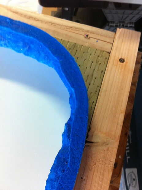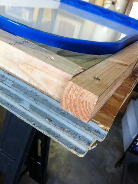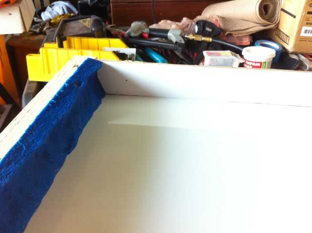 Es importante asegurarse de que la forma mantenga su forma y vas a necesitar acceso a la parte inferior del formulario para vibrar el hormigón, por lo que tiene que ser firme y debe ser elevado.  Usé algunos caballetes plástico baratos para elevarlo.  No lo hacen.  Construir una tabla o utilizar unos caballetes sólidas buena.  Cuando se hace esta cosa, es cambiando pesado.  Más en eso más adelante.  La base de mi forma era una triplicadas hasta capa de madera contrachapada de 3/4.  Es probable que no necesitan ser tan gruesas, pero es lo que tenía.  Corté una hoja en tercios, que me dieron una superficie de cerca de 32 "x 48", un montón grande para mi escritorio.  Los lados de la forma eran solo 2 x 2 corte a la longitud y atornillado a través de la Junta de borrado seco en la madera contrachapada.  Las esquinas deben ser redondeadas.  He tenido algunos 2 x 6 ahí, así que decidí utilizar, haciendo un radio de 6" para el moldeado del silicón, que era lo suficientemente bueno, pero la próxima vez haría un poco más grande, tal vez un radio de 10".