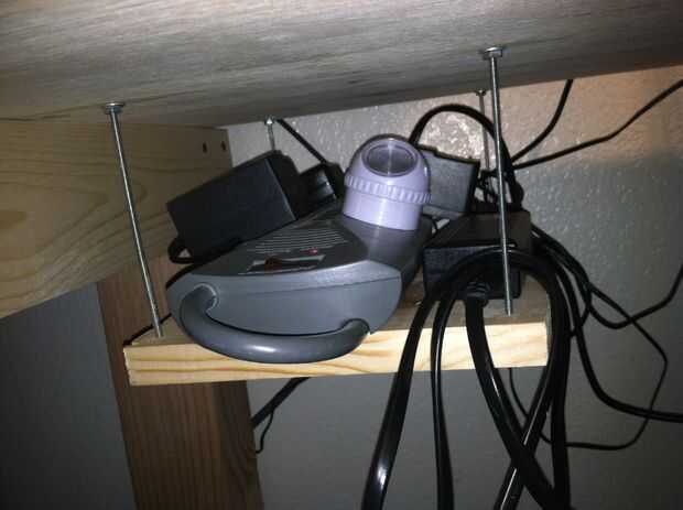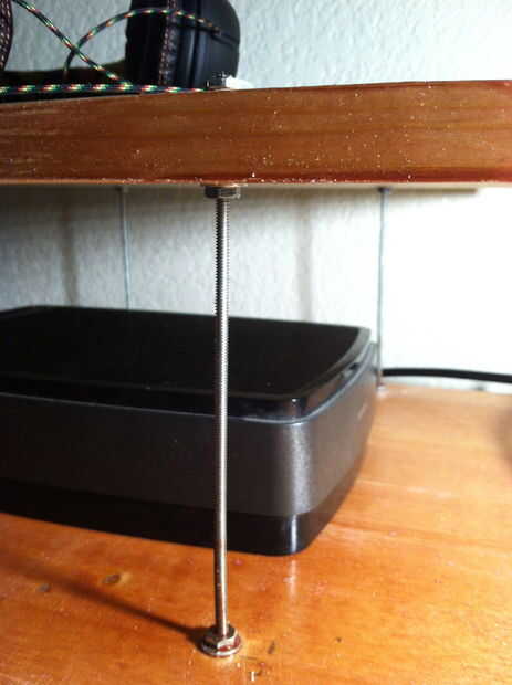 Esto es limpio porque se puede colgar un estante por encima o por debajo de la mesa muy fácilmente. La altura puede ajustarse muy fácilmente. Mi estante inferior apoya una regleta. Para el peso de una regleta, podía usar el diametro más pequeño hilo de todos. Estos cuatro pedazos de hilo de todos pueden hacer muchos estantes por encima o por debajo del escritorio.