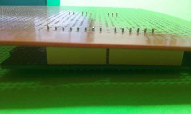Ahora toma el Proto-board y coloque en los alfileres con el lado de cobre hacia arriba para que fácilmente puede soldar los componentes a él.