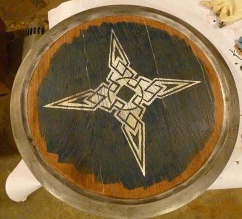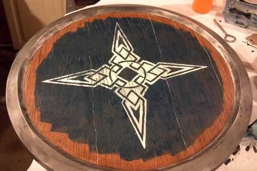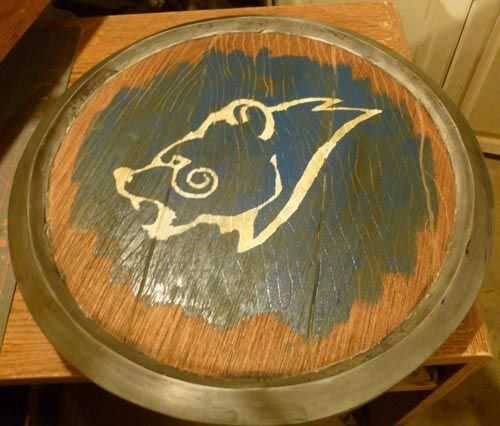Usé pintura de esmalte azul Rustoleum para el lado del símbolo del escudo. Utilizar un rodillo para aplicar dos capas esperando 10 minutos en el medio. El blindaje del casco podría haber usado una tercera capa para hacer más vibrante para igualar el juego. Mezclé azul y negro para aproximar el color Dawnstar.