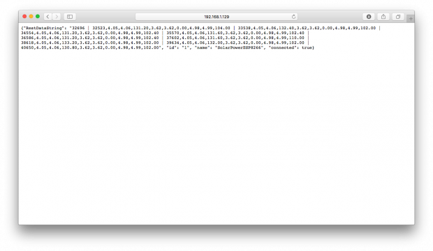 -------- Buffer Count=9 Request received GET / RestDataString HTTP/ Sending command Command: s State: x State of buffer at the start: Added to buffer: RestDataString Added to buffer: 32696 | 32523,4.05,4.06,131.20,3.62,3.62,0.00,4.98,4.99,104.00 | 33538,4.05,4.06,132.40,3.62,3.62,0.00,4.98,4.99,102.00 | 34554,4.05,4.06,131.20,3.62,3.62,0.00,4.98,4.99,102.40 | 35570,4.05,4.06,131.60,3.62,3.62,0.00,4.98,4.99,102.40 | 36586,4.05,4.06,131.20,3.62,3.62,0.00,4.98,4.99,102.40 | 37602,4.05,4.06,131.60,3.62,3.62,0.00,4.98,4.99,110.00 | 38618,4.05,4.06,133.20,3.62,3.62,0.00,4.98,4.99,102.00 | 39634,4.05,4.06,132.00,3.62,3.62,0.00,4.98,4.99,102.00 | 40650,4.05,4.06,130.80,3.62,3.62,0.00,4.98,4.99,102.00 Added to buffer: 1 Added to buffer: SolarPowerESP8266 State of buffer at the end: HTTP/1.1 200 OK Access-Control-Allow-Origin: * Access-Control-Allow-Methods: POST, GET, PUT, OPTIONS Content-Type: application/json Connection: close