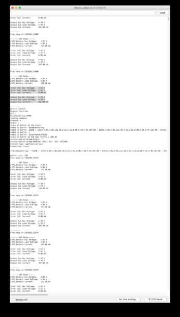 // SAP Buffer Routines void initSAPBuffer() { CurrentSAPBuffer = -1; lastReadSAPBuffer = -1; int i; for (i = 0; i < SAPBUFFERSIZE; i++) { SAPBuffer[i].timeStamp = 0; } } void writeSAPBuffer() { //Serial.print("Entry WriteSAPBuffer C / R "); //Serial.print(CurrentSAPBuffer); //Serial.print(" / "); //Serial.println(lastReadSAPBuffer); CurrentSAPBuffer++; if (CurrentSAPBuffer >= SAPBUFFERSIZE) // wrap around { CurrentSAPBuffer = 0; } SAPBuffer[CurrentSAPBuffer].timeStamp = millis(); SAPBuffer[CurrentSAPBuffer].SAPEntry = currentSAPData; //Serial.print("Exit WriteSAPBuffer C / R "); //Serial.print(CurrentSAPBuffer); //Serial.print(" / "); //Serial.println(lastReadSAPBuffer); } int returnCountSAPBuffer() { int i; int count = 0; for (i = 0; i < SAPBUFFERSIZE; i++) { if (SAPBuffer[i].timeStamp > 0) count++; } return count; } int readSAPBuffer(SAPBufferStruct *mySAPBuffer) { //Serial.print("inReadSAPBuffer C / R "); //Serial.print(CurrentSAPBuffer); //Serial.print(" / "); //Serial.println(lastReadSAPBuffer); // read out all data, doesn't matter the order. The SQL Databoase on the Pi will figure it out... if (lastReadSAPBuffer == -1 ) // deal with first read no matter how long ago { // scan Buffer for smallest > 0 timeStamp - set to lastReadSAPBuffer int i; int smallestTimeStamp = 4294967295; // 2^32-1 int smallestIndex = 0; for (i = 0; i < SAPBUFFERSIZE; i++) { if (SAPBuffer[i].timeStamp != 0) { if (SAPBuffer[i].timeStamp < smallestTimeStamp) { smallestTimeStamp = SAPBuffer[i].timeStamp; smallestIndex = i; } } } lastReadSAPBuffer = smallestIndex; } if (SAPBuffer[lastReadSAPBuffer].timeStamp == 0) { return -1; } *mySAPBuffer = SAPBuffer[lastReadSAPBuffer]; SAPBuffer[lastReadSAPBuffer].timeStamp = 0; lastReadSAPBuffer++; if (lastReadSAPBuffer >= SAPBUFFERSIZE) { lastReadSAPBuffer = 0; } } String assembleSAPBuffer() { int status; SAPBufferStruct mySAPBuffer; String returnString; returnString = ""; returnString = String(ESP.getFreeHeap()); status = readSAPBuffer(&mySAPBuffer); while (status != -1) { if (returnString.length() != 0) { returnString += " | "; } String sensorBuild; sensorBuild = String(mySAPBuffer.timeStamp) + ","; int i; for (i = 0; i < 3; i++) { sensorBuild += String(mySAPBuffer.SAPEntry.busVoltage[i], 2) + ","; sensorBuild += String(mySAPBuffer.SAPEntry.loadVoltage[i], 2) + ","; if (i < 2) sensorBuild += String(mySAPBuffer.SAPEntry.current[i], 2) + ","; else sensorBuild += String(mySAPBuffer.SAPEntry.current[i], 2) ; //Serial.print("sensorBuild="); //Serial.println(sensorBuild); } returnString += sensorBuild; status = readSAPBuffer(&mySAPBuffer); } return returnString; } void printDebugFullSAPBuffer() { Serial.print("DebugFullSAPBuffer State C / R "); Serial.print(CurrentSAPBuffer); Serial.print(" / "); Serial.println(lastReadSAPBuffer); int i; for (i = 0; i < SAPBUFFERSIZE; i++) { Serial.print("index:"); Serial.print(i); Serial.print(" timeStamp = "); Serial.print(SAPBuffer[i].timeStamp); if (SAPBuffer[i].timeStamp == 0) { Serial.println(" SAPEntry = null"); } else { Serial.println(" SAPEntry = Full"); /* SAPData currentSAPData; currentSAPData = SAPBuffer[i].SAPEntry; Serial.println("--------SAP ENTRY-------"); Serial.print("LIPO_Battery Current: "); Serial.print(currentSAPData.current[0]); Serial.println(" mA"); Serial.print("Solar Cell Bus Voltage: "); Serial.print(currentSAPData.busVoltage[1]); Serial.println(" V"); Serial.print("Output Bus Current: "); Serial.print(currentSAPData.current[2]); Serial.println(" mA"); */ } } } // Read data from specific SunAirPlus unit (SAP0 - SAP2) void startSAPINA3221() { ina3221_SAP.begin(); // SAP } void readSAP() { int i; for (i = 0; i < 3; i++) { currentSAPData.busVoltage[i] = 0.0f; currentSAPData.current[i] = 0.0f; currentSAPData.loadVoltage[i] = 0.0f; } currentSAPData.busVoltage[0] = ina3221_SAP.getBusVoltage_V(SAP_LIPO_BATTERY_CHANNEL + 1); currentSAPData.current[0] = ina3221_SAP.getCurrent_mA(SAP_LIPO_BATTERY_CHANNEL + 1); // minus is to get the "sense" right. - means the battery is charging, + that it is discharging currentSAPData.loadVoltage[0] = currentSAPData.busVoltage[0] + (ina3221_SAP.getShuntVoltage_mV(SAP_LIPO_BATTERY_CHANNEL + 1) / 1000); currentSAPData.busVoltage[1] = ina3221_SAP.getBusVoltage_V(SAP_SOLAR_CELL_CHANNEL + 1); currentSAPData.current[1] = - ina3221_SAP.getCurrent_mA(SAP_SOLAR_CELL_CHANNEL + 1); // minus is to get the "sense" right. - means the battery is charging, + that it is discharging currentSAPData.loadVoltage[1] = currentSAPData.busVoltage[1] + (ina3221_SAP.getShuntVoltage_mV(SAP_SOLAR_CELL_CHANNEL + 1) / 1000); currentSAPData.busVoltage[2] = ina3221_SAP.getBusVoltage_V(SAP_OUTPUT_CHANNEL + 1); currentSAPData.current[2] = ina3221_SAP.getCurrent_mA(SAP_OUTPUT_CHANNEL + 1); // minus is to get the "sense" right. - means the battery is charging, + that it is discharging currentSAPData.loadVoltage[2] = currentSAPData.busVoltage[2] + (ina3221_SAP.getShuntVoltage_mV(SAP_OUTPUT_CHANNEL + 1) / 1000); Serial.println("--------SAP Data-------"); Serial.print("LIPO_Battery Bus Voltage: "); Serial.print(currentSAPData.busVoltage[0]); Serial.println(" V"); Serial.print("LIPO_Battery Load Voltage: "); Serial.print(currentSAPData.loadVoltage[0]); Serial.println(" V"); Serial.print("LIPO_Battery Current: "); Serial.print(currentSAPData.current[0]); Serial.println(" mA"); Serial.println(""); Serial.print("Solar Cell Bus Voltage: "); Serial.print(currentSAPData.busVoltage[1]); Serial.println(" V"); Serial.print("Solar Cell Load Voltage: "); Serial.print(currentSAPData.loadVoltage[1]); Serial.println(" V"); Serial.print("Solar Cell Current: "); Serial.print(currentSAPData.current[1]); Serial.println(" mA"); Serial.println(""); Serial.print("Output Bus Bus Voltage: "); Serial.print(currentSAPData.busVoltage[2]); Serial.println(" V"); Serial.print("Output Bus Load Voltage: "); Serial.print(currentSAPData.loadVoltage[2]); Serial.println(" V"); Serial.print("Output Bus Current: "); Serial.print(currentSAPData.current[2]); Serial.print