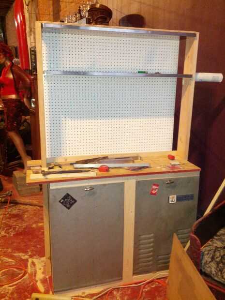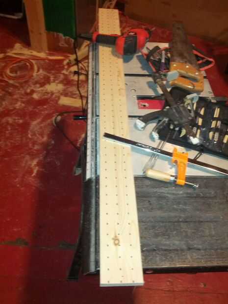 Ahora que tienes un gran estante construido su tiempo agregar el perforado en la parte posterior tan bonito mucho a cortar para adaptarse a la forma que quieras. Hice mío desde la parte superior de mi banco y luego ir hasta la parte superior de los estantes. Entonces tomé un 1 x 4 cortarla para ajustarla al tamaño de la espalda del Banco de entonces puso bajo algunos extra pegboard que tenía entonces tomó un lápiz y marcados todos los orificios a lo largo de él una vez que se me hizo los agujeros perforados en ella desde pequeñas, medianas y grandes por lo que pude guardar mi escultura herramientas y otras cosas en una fácil. Entonces corté un 1 x 4 por lo que sería un 1 x 1 1/2 que entonces hice una caja cara 3 de ellos que se ajustan alrededor de la 1 x 4 para que se vea super lujo. No clavar esta parte todavía aunque todavía tenemos una bonita pieza de metal de hoja para agregar que si usted quiere.
