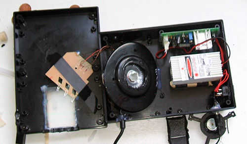 Usted necesitará un módulo de láser verde laboratorio estilo, un par de auriculares antiguos, una caja, un interruptor, un adaptador AC/DC y algunas herramientas de mano.