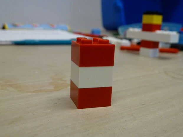 6.) colocar un ladrillo de 2 x 2 blanco encima de un ladrillo de 2 x 2 rojo.