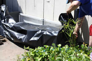 el n las tuercas de la construcción de un estanque de ranas del jardín. Bueno para el medio ambiente!