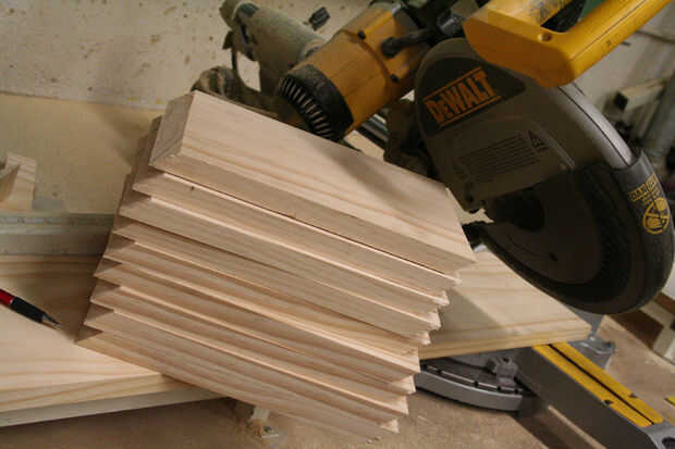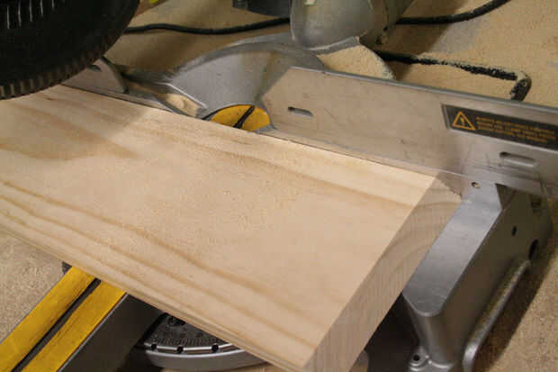 Una vez hecho esto, medir exactamente (o como a exacto como usted puede conseguir) 10" desde el borde derecho de la hoja y marcar ese lugar derecho en la sierra para cortar ingletes. Mover la Junta a esa posición, asegúrese de que esté nivelada, rezar a cualquier Dios o dioses orar y hacer el corte. Ahora tienes tu primer 10" pieza. Luego deslice la Junta a ese mismo punto exacto y corte otra vez. Hacer esto hasta llegar a la última pieza en ese tablero. En total, usted debe han podido encajar nueve piezas por ahi con algunos retales sobrantes, como se muestra.