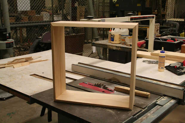 Las primeras piezas son siempre los más difíciles. Hay algunos trucos que usted puede tratar de asegurarse de que obtener un ángulo de 90 grados. La manera mejor y más fácil de hacerlo es establecer los bordes que van a ser las esquinas exteriores hasta al lado del otro. Aplicar cinta de enmascarar a los bordes para crear de una bisagra. A partir de ahí, aplicar pegamento de madera a ambos lados de las piezas se pegan juntas y cierre para arriba. Asegúrese de que su pistola de clavos clavos y la presión está en el compresor de aire y está listo para funcionar. Asegúrese de que los bordes se alinean y que todo está cuadrado y disparar sus primeros agujeros. El único propósito de uñas es unir los tableros mientras el pegamento seca. Cubriremos los agujeros crean más adelante.