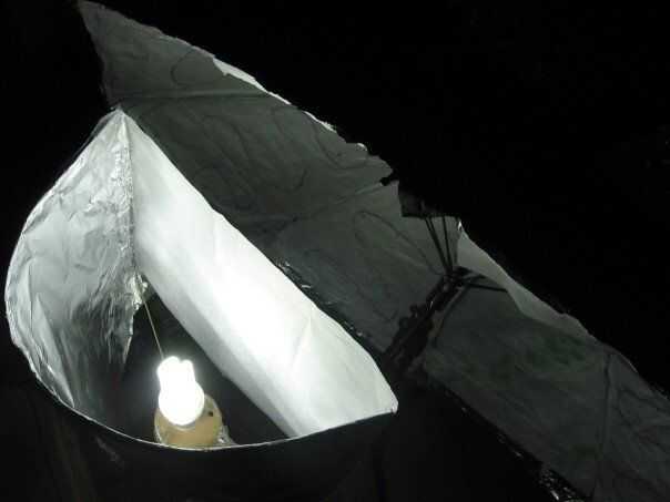 2. Aplique la hoja doblando la tapa 1-2 cm de la hoja sobre la parte superior de los soportes de suspensión. Papel sin arrugas crea un reflector incluso y hermoso. Asegure con cinta.