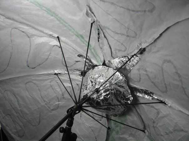 3. construir un cono de 60 grados de papel de aluminio y colóquela alrededor del tubo entre los tirantes y la tapa superior de la sombrilla.