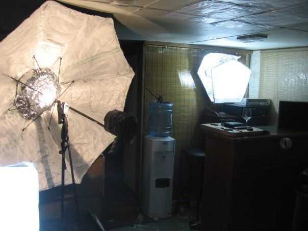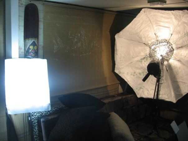 aquí es mi estudio de fotografía casero!Para la iluminación (que es generalmente más caro):Dos lámparas de abrazadera de trabajo (< 15 total)Una vieja lámpara funky con accesorios flexiblesun fluorescente inclinada Suspension (inclinada con una caden