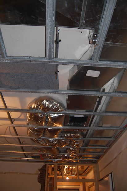 Ya que estábamos haciendo una renovación intestinal pudimos poner en el aire, pero no podía ser regular AC. El climatizador se colocó lo más lejos del estudio como sea posible, y los conductos fueron de gran tamaños y tenían unas curvas extras. Circula la misma cantidad de aire, pero ya que fluye más lentamente no se oye el aire que acomete. Una ventilación conduce al estudio, el otro en el armario del equipo. Otra diferencia con la CA regular es el aire de retorno. Ya que nuestra habitación está completamente sellada habíamos a incluye orificios para permitir que el aire hacia fuera, en lugar de confía en grietas alrededor de la puerta. Hacerlo con un tubo flexible de aluminio fino habría perforado un gran agujero grande en la insonorización, por lo que utilizamos 50 pies de tubo de aislamiento en su lugar, girando y girando lo más posible: aire escapa, pero el sonido no puede hacer a través de.