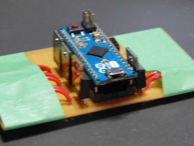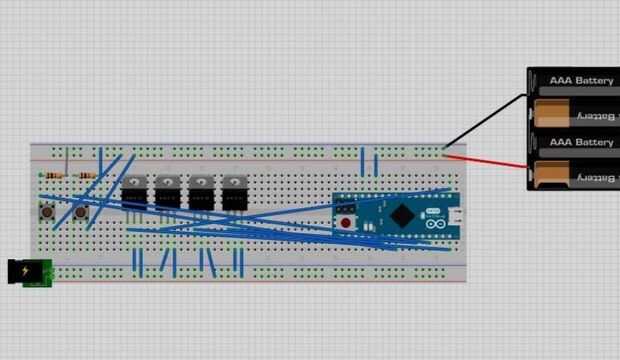 La electrónica es bastante simple. Todo lo que es, es un mosfet de canal N por músculo y un botón de resistencia de 10 k para cada dos músculos. Todo soldado a un tablero pequeño tira de pan y tiene suficiente mosfets por cuatro músculos (2 brazos). también tiene espacio para dos botones que se unirá. El sistema entero es controlado por un Arduino Micro, pero se necesita una batería para suministrar más energía a contraer los músculos. Esta batería se une a los mosfets que se activa para enviar pulsos de Arduino.