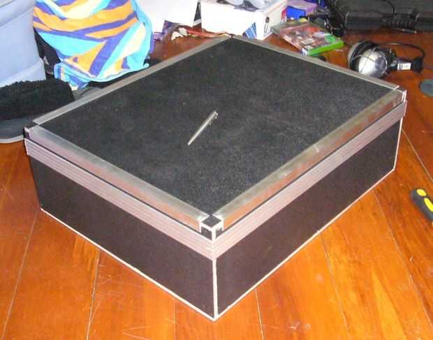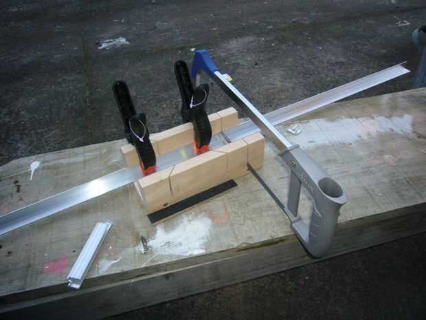 A continuación, cortar las protuberancias de la L para los bordes de la caja. Compré el mío en la ferretería local, eran muy baratos. No es necesario ser muy preciso sobre la longitud, porque los extremos se cubrirán por las esquinas (¿mencioné que construir un flightcase es fácil?). Si tienes una potencia tronzadora estarás oro, pero sólo usé una cuadra de mitre $2 y una sierra para metales. Usted necesitará algunas de esas abrazaderas frescas aunque [Foto 4].