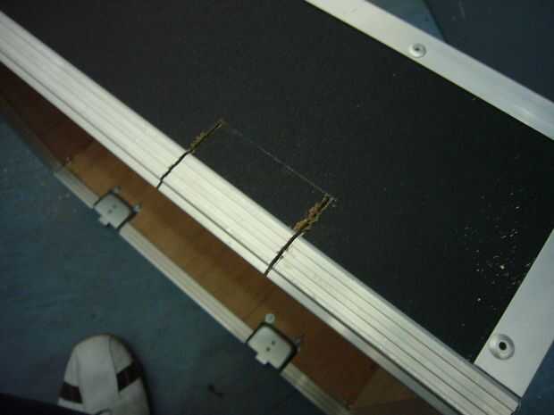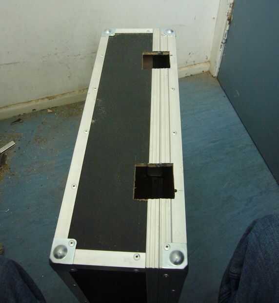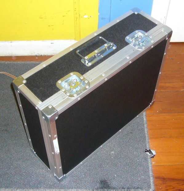 Remache en las capturas de la mariposa. Deje una separación de 1mm entre las dos mitades o la captura para que tire de la tapa firmemente en al cerrar el caso. Del remache de las capturas en con arandelas en el interior. Para la manija, solo ponerlo donde quiere, algunos agujeros y remache nuevo con arandelas. Coloco mi mango ligeramente hacia el lado de base, como mi pedal es lo más pesado en el caso y quería que el caso para colgar verticalmente de la manija.