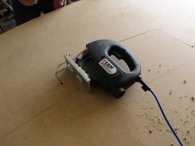 Una vez que has transferido tus planes a la madera, puede empezar a serrar. Utilizamos una sierra de calar eléctrica. Alternativamente, si usted tiene acceso a un gran router CNC o cortador del laser, puede utilizar, ya wil nunca las medidas mal, sería perfecto.