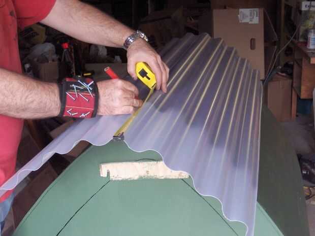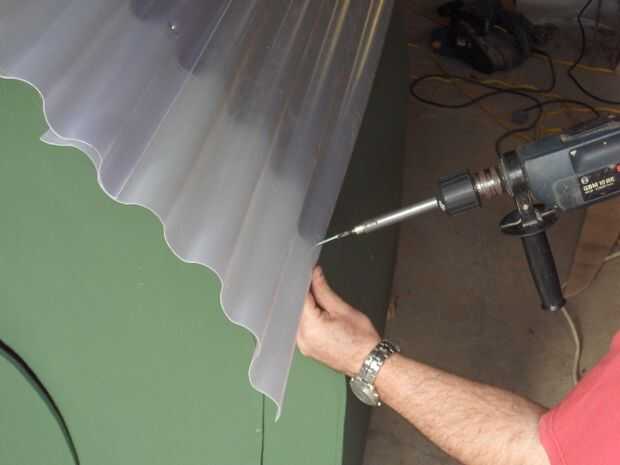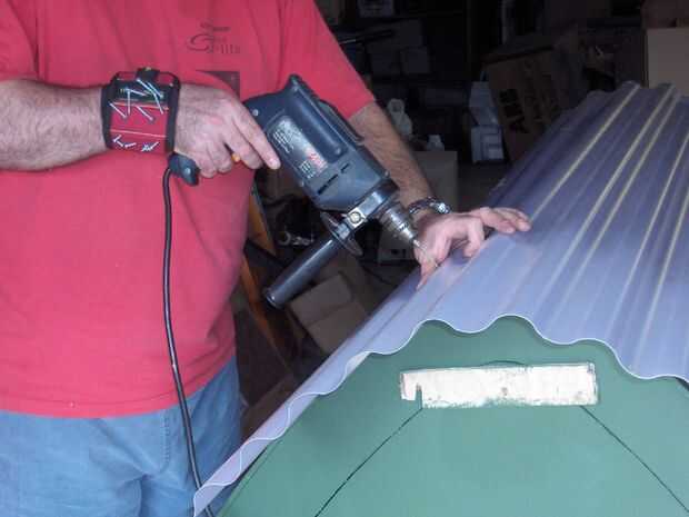 Coloque una hoja sobre la cooperativa de manera que el corrugado medio es boca abajo en el pico. Mídalo, dividirla en dos y ajustar la posición de la hoja por lo que igual proyección ambos extremos. Poner los tornillos a través de las tapas de los corrugaciones segundo en ambos lados y ambos extremos (es decir, nuestros tornillos), para fijar la primera hoja. Es mejor taladrar agujeros piloto primero; a través de la plástica y en el borde del extremo paredes en mi caso, pero probablemente podían perforar directamente a la capa curva si sus tornillos son bastante cortos.