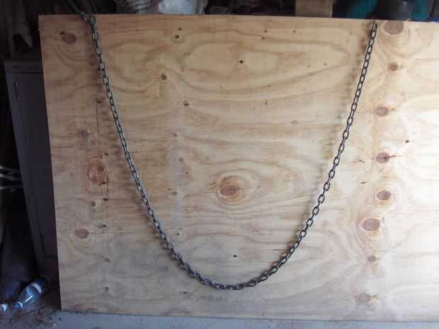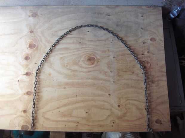 Bueno, duh. Después de mucho web surf y aprender más acerca de las curvas que pensaba posible, y después de construir realmente la mayor parte de la cooperativa, se me ocurrió la brillante idea de trazar la forma de una longitud de 2.4m de cadena de clavado para capas. Al medir 400mm abajo de la línea central de la base, yo podía entonces cuadrados-off la curva con un par de clavos/tornillos para permitir una forma más amplia.