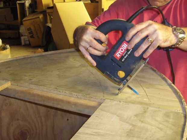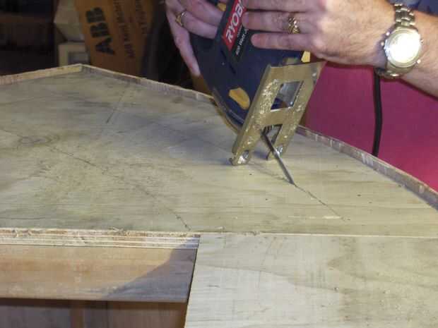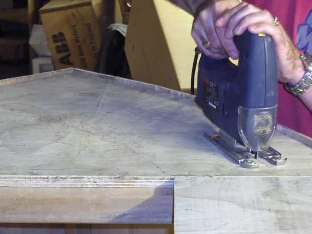 Usar la sierra caladora para sumergirse corte ** en el capas en una sola línea a poca distancia de la esquina donde dos líneas se unen. Una vez que has hecho un agujero, recortar hacia la esquina y repita el proceso para la línea contigua. Un pequeño trozo de capa en la esquina para que deje caer más adelante a través del tornillo.
