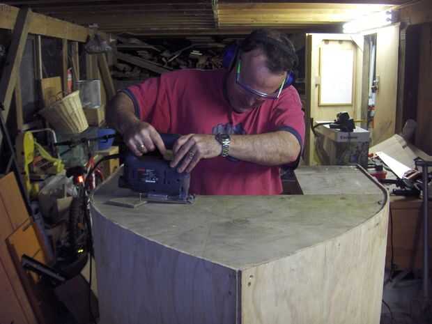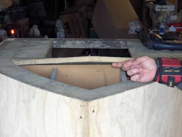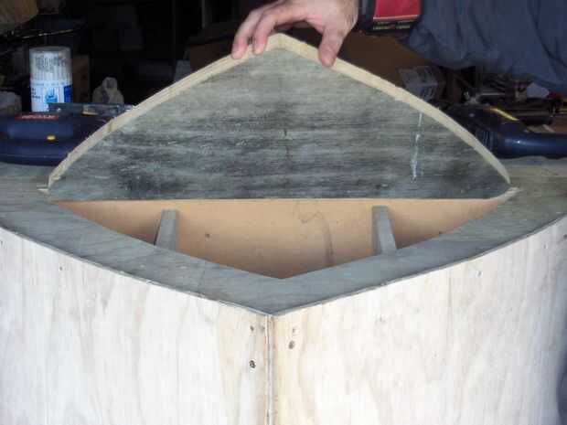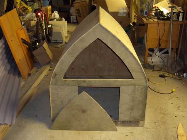 Caben dos bisagras en la parte inferior de la puerta (en la línea recta). Guardé las piezas de soporte mientras lo hice. Quitar los soportes y darse cuenta de que la geometría de las esquinas inferiores no permite abrir completamente la puerta! Para solucionarlo que tuve que redondear las esquinas con la sierra caladora y pegue las piezas del triángulo pequeño esto hizo en sus esquinas. Si había hecho las esquinas redondeadas en un principio, que podría haber hecho un corte completo de la esquina pico derecha abajo de una curva, a lo largo de la parte inferior y hacia arriba la curva usando piezas de soporte cuando fui. Retrospectiva: maravilloso. Vea el paso 6 para el otro extremo como lo hice.