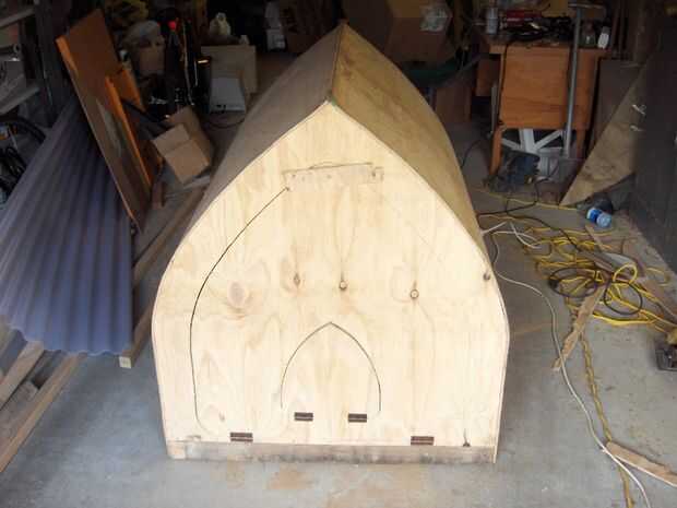 Utilizar una cosa redonda pequeña (en mi caso el contenedor de broca) como una plantilla para redondear las esquinas inferiores. Incisión la puerta pop-agujero hacia fuera, recordando a detrás-cortó el pico primero, luego vuelta a la sierra y corte alrededor de la línea hasta llegar a la cima otra vez. Si la cooperativa hubiese sido catenaria en vez de gótico, hubiese redondeado el pico también. [Retrospectiva: podría haber hecho que de todos modos, supongo que...].