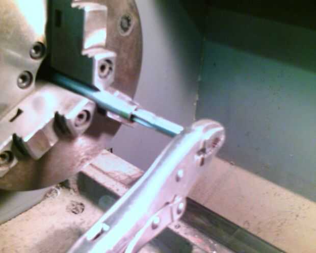 Afortunadamente el árbol tenía una rosca derecha y se me ocurrió tener a mano el grifo métrico adecuado. Lo que no tengo era una llave de grifo, en lugar de salir de la tienda se puede ver que tomó el asunto en mis propias manos y agarró un par de mordazas de tornillo de banco.