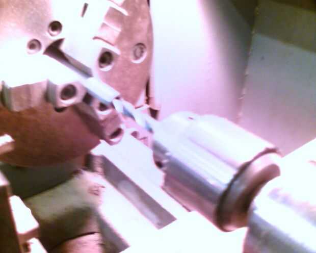 Para hacer los ejes corté dos pedazos cortos de una 1/2" diámetro suave varilla de acero que se correspondería con las poleas stock que compraría. Ellos tiraron uno a uno en un torno de maquinista y después medir el eje del motor, aprendí que no sólo era una rosca a la izquierda, pero era métrico para arrancar! Me perforó el eje y había aprovechado con la llave correcta, que adquirí de nuestra sucursal de Granger.