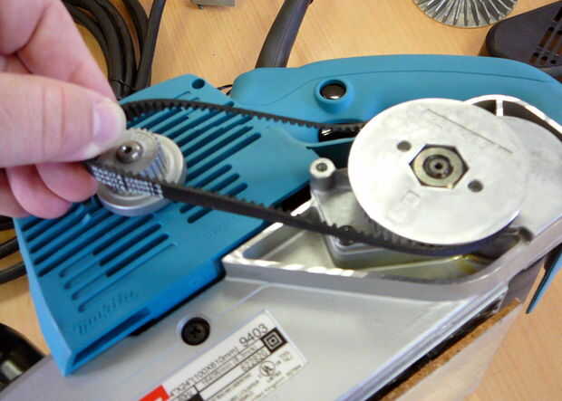 La correa es una correa dentada o dentada, que significa que va a tener que ir.  ¿Por qué?  Bueno, a la velocidad que estamos buscando de una correa dentada será rasgado en pedazos, y creo o no tenemos necesidad de dar cabida a un "pequeño" desliz entre la correa y la polea sobre la puesta en marcha, así que como he dicho, la correa dentada era malas noticias.