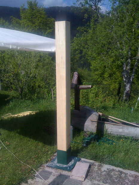 Para evitar la gota de agua dentro de las diferencias entre metal y madera llena los huecos con silicona y alquitrán (generalmente utilizado para aislar ventanas RV). También hago un agujero en la parte inferior del metal apoya a evitar que el agua condense para permanecer en contacto con la madera por mucho tiempo. Soportes metálicos cubiertos y protegidos de la lluvia por el techo de gazebo para que los orificios de la parte inferior no deberían ser un problema.