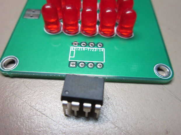El microcontrolador es el último componente a soldar. Asegúrese de que el final del microcontrolador con el punto se quede alineado con el blanco del contorno en el tablero. Check doble y triple se orienta correctamente antes la soldadura.